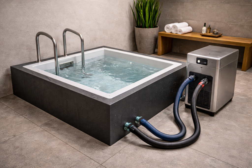 A cold plunge chiller is a standalone cooling unit that circulates water from your tub, cools it using refrigeration, and returns it at a controlled temperature.